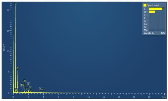 An energy dispersive X-ray is considered one of the most authentic and reliable methods to detect the elements and find out their percentage in biomass [57]. The EDX results for this biomass are shown in Table 4 and Figure 6. The results indicate a high density of carbon and oxygen with C-O bonds is available in the biomass [58]. The inorganic components, magnesium (Mg), silicon (Si), aluminum (Al), sulfur (S), phosphorus (P), and calcium (Ca), for this biomass are comparable with the literature [59].
