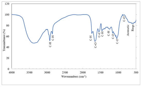 Fourier transform infrared spectroscopies are used to determine the connection between the arrangement and the chemicals of the biomass. Figure 7 depicts the FTIR results from 4000 to 500 cm−1 wavenumbers. Table 5 describes the corresponding groups according to the benchmarks of the literature [60,61]. The reported peaks in the wavenumbers, 2931 (cm−1) and 2860 (cm−1), were for the stretching of C-H bonds in the aliphatic structure of hemicellulose, cellulose, and lignin [62]. The bending of C-H for hemicelluloses and cellulose is between 2000 and 1650 cm−1 where the sample represented 1749 cm−1 [61]. The crest at 1668 cm−1 was for the C=O bond extension within hemicellulose [62].