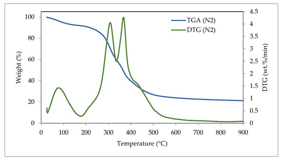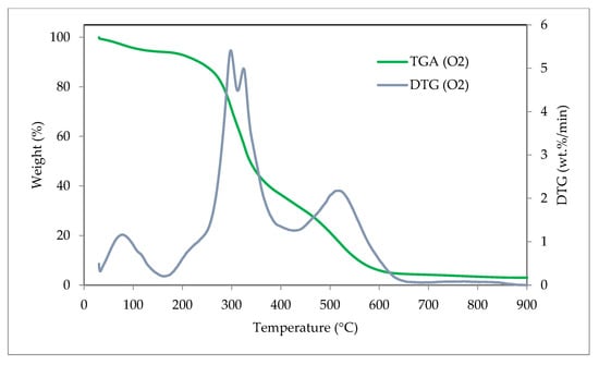 Thermogravimetric analysis is a significant method for understanding the series of reactions that take place during thermochemical processes [68]. The TGA and the DTG graph of the barley waste under the pyrolysis and the combustion conditions are represented in Figure 8 and Figure 9, correspondingly. The consequent weight loss of the sample is described in Table 6 at different temperature ranges for both conditions. There are three main stages for calculating moisture in biomass and the breakdown of lignocellulosic constituents (hemicellulose, cellulose, and lignin) [51]. Weight loss occurs when light volatile matter is removed at temperatures up to 100 °C, when moisture is removed at temperatures up to 130 °C, when heavy volatile matter is removed at temperatures up to 250 °C, when cellulose is decomposed at temperatures up to 500 °C, and when lignin is gradually broken down at temperatures up to 900 °C [69].