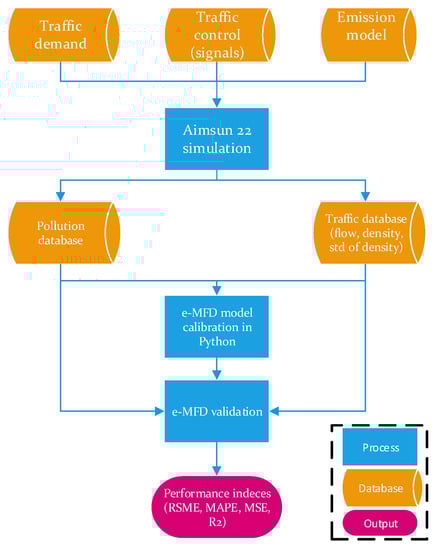 The first step in our methodology is acquiring network-level emission and traffic data. The data could be collected from the field or generated through microscopic simulation software to mimic real-life scenarios. Since collecting different traffic congestion levels and incident data in real life is costly, this study used Aimsun [25], a microscopic simulation platform, to model the proposed scenarios used in this study. The traffic demand, traffic control, routing strategies, and emission model [7] of each specific scenario were imported into the simulation software. Accordingly, traffic states (i.e., speed, density, and standard deviation of density) and network pollution were generated by Aimsun and used for e-MFD model calibration. Two networks were used in this study. A synthetic Manhattan-like grid network and Blacksburg, VA, USA, with a realistic demand level and traffic signal setting. Three different scenarios were considered to validate the developed model for the grid network. The first scenario considered a uniform demand pattern, similar to what was used for model calibration but with different random seeds to mimic the daily traffic dynamics variability. The second scenario considered a directed traffic demand to simulate rush hours, evacuation, and special event situations where a large portion of trips are generated from and attracted to specific regions in the network. The last scenario considered a lane closure to resemble a traffic incident situation. Only the similar demand to calibration with different random seeds scenarios (like the first scenario for the grid network) was used to validate the developed model for the Blacksburg network. Figure 1 shows our modelling framework.