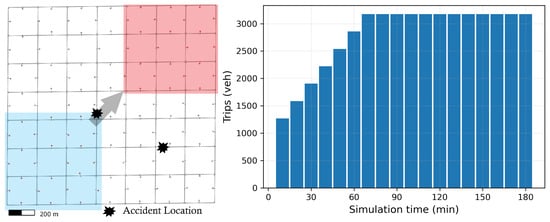 Two accidents were created to test the model stability in the presence of disruption in the network. The location of each accident is marked in Figure 2. Each accident closed one lane from the corresponding section during the simulation period. Accident locations were selected based on their density level at the end of the second hour. Previous studies showed that in a grid network, the accidents that occurred on the link closer to the center of the network have more impact on the network performance, such as the trip completion rate and travel time [27,28]. Accordingly, this study followed the same logic for accident location selection. Each accident scenario was replicated three times with different random seeds.