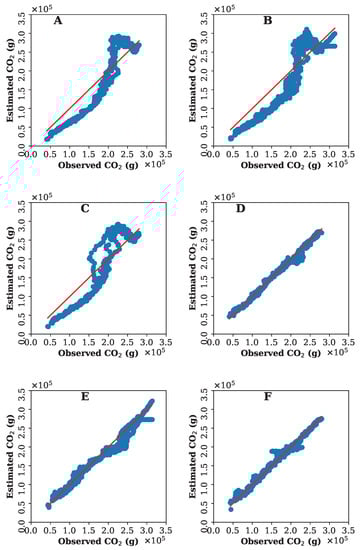 In this section, the relationship between the network-level traffic variables and the levels of emissions is established. Later, the model calibration and validation are explained. Figure 3A shows the relationship between the regular MFD (flow and density) and the level of CO in the network (shown in colours). The MFD suggests that the increase in the level of congestion is associated with an increase in the level CO. The MFD shows that the critical density is 35 veh/km. Based on this observation, a binary variable is created (, which takes value one if the density is smaller than 35 veh/km) to separate free flow and congested. The relationship between density and CO is shown in Figure 3B. The Pearson correlation coefficient suggests a high correlation between density and CO (r = 0.93). Figure 3B shows that CO increases at a higher rate in the free flow branch and increases at a lower rate as the flow reduces after reaching capacity. However, the total emission amount is higher in the congested branch despite increasing at a lower rate than in the free-flow branch. Figure 3C shows an inverse relationship between speed and CO, which is confirmed by the large and negative Pearson correlation coefficient (r = −0.92). A mild slope (for lower speed values) followed by a steep slope (for higher speed values) were observed. Figure 3D shows a positive relationship between the standard deviation of density and CO, which is supported by the large correlation coefficient (r = 0.88). Before reaching the capacity, the standard deviation of density and CO increase at a higher rate than after reaching the capacity. Also, there is no strong relationship between the standard deviation of density and CO for standard deviation values larger than 100 veh/km. Similar results were reported about the relationship between the standard deviation of density and flow at different congestion levels [22]. The increase in standard deviation density at lower density levels reduced the flow. However, the density standard deviation did not impact flow at higher congestion levels. Figure 3E represents the emission MFD (e-MFD) for this grid network which relates network speed and density to the total CO observed in the network. The free flow branch of our e-MFD (density < 35) is similar to what [9] reported for Athens, Greece. However, the congested branch was not observed in realistic cases due to congestion prevention.