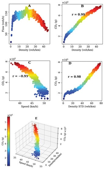 Simulation results for Blacksburg, VA: (A) MFD; (B) density and CO; (C) speed and CO; (D) standard deviation of density and CO; (E) e-MFD.