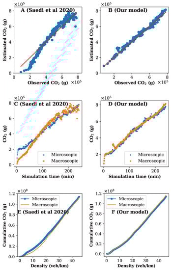Validation results for Blacksburg Network: (A) Saedi model [13]; (B) Our model; (C) CO rate (Saedi [13]); (D) CO rate (Our model); (E) Cumulative CO rate (Saedi [13]); (F) Cumulative CO rate (Our model).