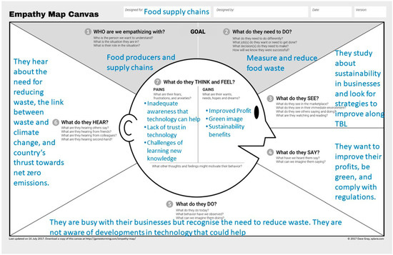 An empathy map canvas [54] is sometimes used to explain business models. Standard versions of the canvas (e.g., https://gamestorming.com/empathy-mapping/ accessed on 27 September 2022) outline some of the building blocks identified by Osterwalder & Pigneur [53]. Figure 2 gives an example of an empathy map canvas for the business model based on modern digital technologies for FWR in food supply chains.