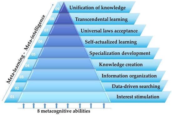 Learners become meta-learners, and more accurately meta-thinkers, the moment they can transcend the current state of knowledge and move to the next level of comprehension [12,41]. The crucial thing for learners is not to follow a path but to discover or develop a passion for learning that will constantly motivate them to bushwhack a path of their own, even through uncertain terrain. That will encourage meta-learners to transcend their limitations and stereotypes, use all the available mental capacity and find their path to holistic learning [102]. This only happens when learners find a transcendental purpose and hitch their wagon to something larger than themselves. Only then can they discover their true potential and realize the role that they will play in writing the next great chapter in future societies. At this meta-level, self-oriented motives for learning—such as the desire to have an interesting or enjoyable career—are not enough. On the contrary, learning requires dedication and a desire to follow a higher purpose. This is why transcendental learners such as scientists can work on a ‘boring’ task with unreduced interest and dedication [103].