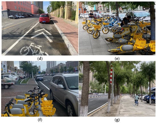 Comparison of travel environment between new and old urban areas ((a–d) for old urban areas, (e–g) for new urban areas). (a) Jingyu Business Circle, Daowai District; (b) Central Street Business Circle, Daoli District.; (c) Qiulin Business Circle, Nangang District; (d) Lesong Business Circle, Xiangfang District; (e) Wanda Business Circle, Haxi New District; (f) Wanxianghui Business Circle, Songbei District; (g) Qunli Business Circle, Qunli New District.