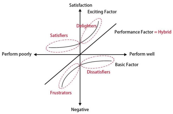 Kano proposed the three-factor theory from the two-factor theory, which is mainly used to classify and prioritise the needs of customers []. At the same time, the three-factor theory takes into account the nonlinear, asymmetrical relationship between the measured object and overall satisfaction []. According to the three-factor theory, the influencing factors are divided into three categories: performance factors, basic factors, and excitement factors according to their effects on overall satisfaction [], as shown in Figure 3. The basic factor is considered a “must” factor and significantly impacts overall satisfaction when it performs poorly, but only a minor impact when it performs well. The excitement factor was considered an “additional” factor that had a significant impact on overall satisfaction only when it performed well. The effect of the performance factors is linear, while the effect of basic and excitatory factors is nonlinear.