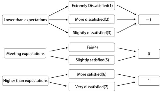 First, a normal distribution analysis using SPSS 26.0 yielded an overall mean satisfaction value of 4.37, so four and five were selected as reference variables and then the 31 travel environment elements were recoded. Respondents rated their satisfaction with the travel environment on a scale from 1–7, and the scored data were then recoded into three values: −1 (very dissatisfied, dissatisfied and slightly dissatisfied), 0 (average and slightly satisfied) and 1 (satisfied and very satisfied), indicating below expectations, in line with expectations, and above expectations, respectively, as shown in Figure 4.