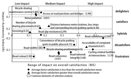 Impact-asymmetry analysis matrix of the bike-sharing travel environment in old urban areas. Note: the numbers in brackets are the average satisfaction for each element.