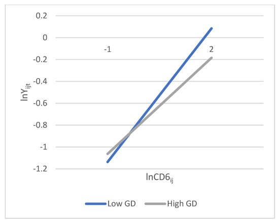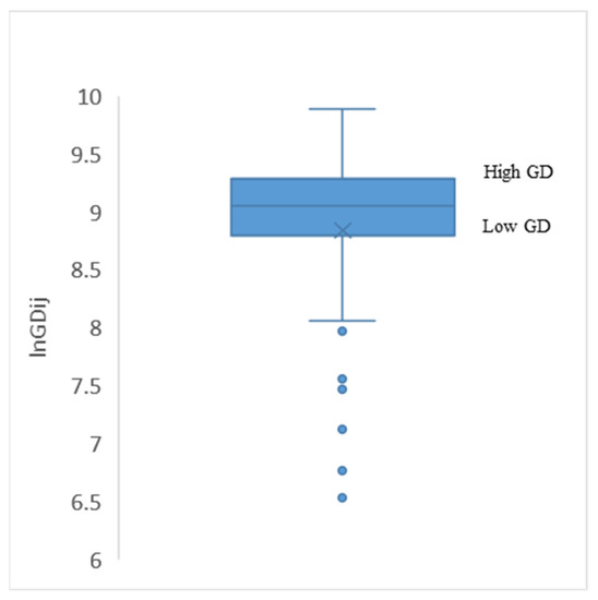 In order to test the robustness of the dynamic model setting, this study adopted both four- and six-dimensional cultural distance measurements developed by Kogut and Singh [25]. For both cultural distance indices, lnCD has a significant positive impact on Chinese outbound tourism flow in GMM estimation (1) and (3) in Table 5. When adding the interaction term, cultural distance still has a significant and positive influence, while the coefficients of the interaction term of (lnCD) × (lnGD) are negative in GMM estimation (2) and (4). A simple slope diagram was established to verify the interaction effect between cultural distance and geographical distance on outbound tourism flow [48]. The distribution of geographical distance is shown in Figure 1 with a lower quartile and upper quartile to represent the low geographical distance level (Low GD) and high geographical distance level (High GD). Figure 2 shows the relationship between CD and outbound tourism flow at the low GD versus the high GD by taking GMM (2) in Table 5 as an example [49].