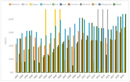 The CO2 fingerprint of machines in different production areas depends on other minerals and production requirements. As GHG emissions vary according to the type of equipment used in artisanal or industrial mining, it is recommended that governments act on the kind of mining and extraction techniques through the privileges of the local mining industry. Therefore, selection significantly impacts the emission rate of greenhouse gases. Data on natural resource extraction in the Congo show that the mining industry produces significant amounts of carbon gas in the atmosphere (Figure 2). Diamond production remains the most carbon-emitting ore from 1997 to 2019, emitting 11.8 gt CO2 (36%). Cobalt production is heavily mined in Congo, resulting in a sustained GHG intensity of approximately 11.2 gtCO2 (34%) in 2019. Between 1997 and 2019, the emissions curve shifted according to demand and global economic conditions. Carbon dioxide emissions reached 7920 tons in 2012 and 9260 tons in 2019.