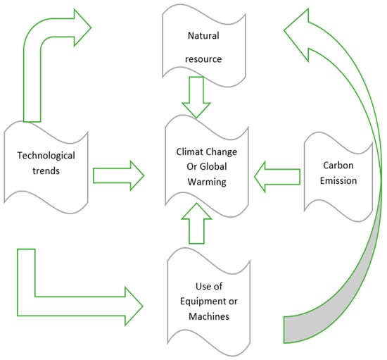 Natural resource demand and equipment are significant predictors of climate change. The following hypotheses were developed from the literature and are presented in Figure 5. That deepens research on using technology tools in the mining industry with climate change or global warming to provide robust results. In this framework, we attempt to explain the need for reform of the Congolese mining sector, especially concerning carbon sequestration and environmental protection. The framework has the following form: