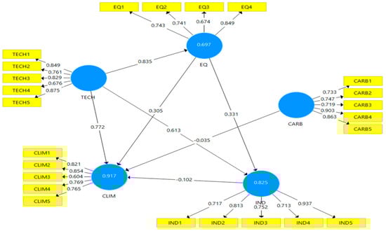 Among the main criteria for evaluating structural models in the P.L.S. approach, tests are recommended hypothesis testing, coefficient of determination R2, effect index f2, and the Stone–Geisser coefficient (Q2) [107,108]. Therefore, our model proposes three exogenous latent variables (the explanatory variables: EQ, C.L.I.M., IND) and two endogenous latent variables (the explained variables, TECH, CARB), see Figure 6. We used SmartPLS software for data analysis and hypothesis testing.