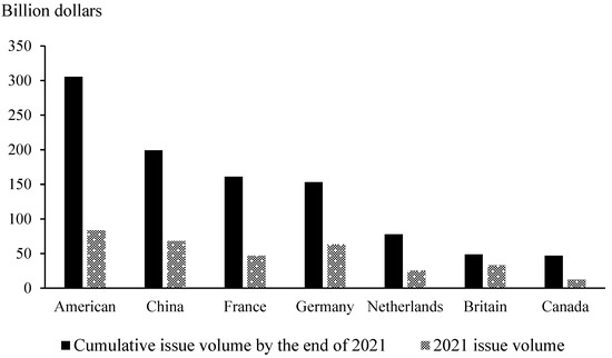 The booming development of the green bond market is evident worldwide. As shown in Figure 3, according to a related report released by the Climate Bonds Initiative in 2021, the cumulative issue volume of China’s green bonds was the second in the world, which also fully illustrates the importance of China’s green bond market in the global green bond market. As a result, research on the green bond market has also been pursued by a number of scholars.