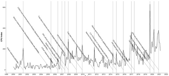 Climate policy uncertainty indicator. Climate Policy Uncertainty refers to the difficulty in predicting the likelihood of future climate events when climate policy changes. Gavriilidis [37] constructed a CPU index with the help of big data methods based on keywords such as “uncertainty”, “environment”, “climate change”, “climate risk”, “policy”, “legal”, and “regulatory”. Figure 4 shows the CPU annotated index, which includes the U.S–China Joint Statement on Climate Change, the UN Climate Action Summit (China’s position and actions), etc. It contains many international climate policy changes, and China has been actively cooperating with the global community to address climate change in the past decade, and Ren et al. [38] used this index to study total factor productivity in China. For this reason, this index was selected to measure climate policy uncertainty (CPU) and examine its impact on green bond price volatility.