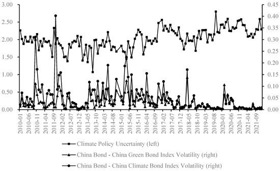 We investigated the effect of climate policy uncertainty on green bond market volatility at the level of time-series. Global climate change and socially responsible investment behavior have become important topics in academia (see Liu [1], Tian et al. [2]). As the global warming trend becomes increasingly severe, output and labor productivity may be severely affected [3]. Moreover, as climate change mitigation policies are implemented one after another, prices, productivity, employment, and output will all be affected, and monetary policy is no exception. Thus, the great uncertainty of climate-related events and policies may dampen investment and other economic activities. In the event of extreme weather conditions such as heavy rainstorms, the government may introduce relevant climate policies, and with climate policies constantly being adjusted, the impact of climate-related policies on the green bond market cannot be ignored, considering the purpose of green bond creation. Further, the formulation, implementation, and adjustment of climate policies are influenced by the objective natural environment, human awareness, and emergencies, and it is difficult to predict the possibility of future climate events when climate policies change. Because of the “bond” nature of green bonds, the impact of monetary policies such as interest rates is also crucial, and monetary policy is also potentially influenced by climate policy. Therefore, this study explores the time-varying impact of climate policy uncertainty (CPU) on green bond market volatility.