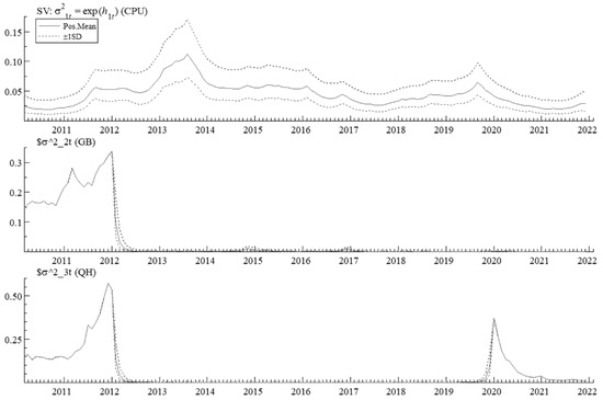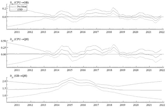 Figure 9 reflects the stochastic volatility of CPU, GB and QH, from which it can be seen that there is a wave of a peak in CPU between 2013–2014, as well as a small peak in 2019–2020, which is to some extent also related to the intensity of relevant policies. The volatility of GB, on the other hand, is mainly reflected before 2012, which may also be related to the imperfect growth of the green bond market at this time.