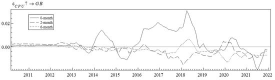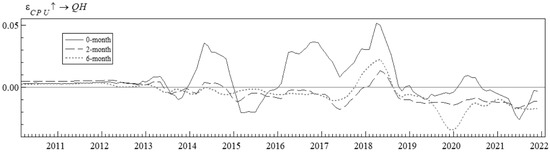 Figure 10 shows the simultaneous relation posterior estimates, and it indicates that the synchronization relationship of the structural shocks is time-varying. Figure 11 represents the time-varying impulse responses for a 0-month horizon, a 2-month horizon, and a 6-month horizon, respectively.