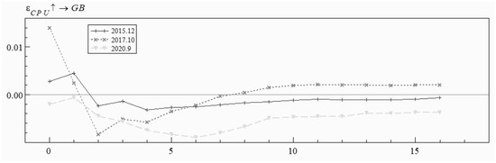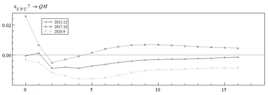 Figure 12 gives the impulse response plots of the shocks of CPU on green bond price volatility at the three-time points. There is some variability in the response patterns of CPU on the shocks to green bond price volatility at the three-time points, and the degree of impact of CPU on green bond price volatility is greatest in the short term, after which the impact fades away. This conclusion is in accordance with the previous finding on the time-varying impulse response of CPU. In December 2015, the impact of CPU on green bond price volatility is positive in the first 2 periods, becomes negative in period 2, and then gradually weakens, oscillates, and converges to 0. In October 2017, the extent of the impact is greatest in period 0, and changes from a positive shock to a negative shock after period 1. In September 2020, the impact is weaker, with a more pronounced negative shock in period 1, and then gradually converges to 0. China’s green bond market has developed rapidly since 2016, and thanks to China’s policy of strongly supporting the development of the green bond market, green bonds are popular in the financial market, and green bonds have shown good risk tolerance at this time, enabling them to effectively support the green transition and hedge against climate policy uncertainty. From December 2015 to September 2020, China has always attached importance to the response to and governance of climate change, and at this time investors are bullish about the prospects of China’s green bond market and tend to buy more green bonds [2].