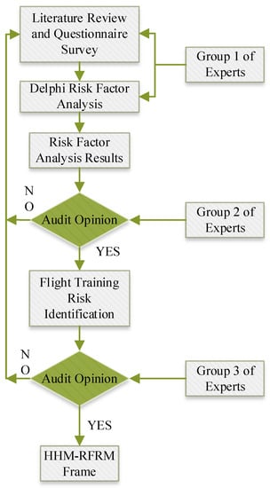 The analysis of flight risk factors is the basis of risk identification. This paper uses the HHM model and the risk identification framework [] (Pilot-in-Command, Aircraft, Environment, External Pressures—PAVE) to identify risk sources, which requires constructing a risk scenario framework for the risks encountered in flight. Based on the iterative idea of the hierarchical holographic modeling process and the Delphi method, this paper constructs the HHM-PAVE framework to identify the risk factors in flight training. The specific process is shown in Figure 2: