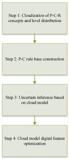Based on the above risk assessment matrix, multiple criteria, and the CM method, this paper proposes an improved risk assessment matrix-cloud model (IPC-CM), which aims to provide more accurate assessment results for quantitative risk assessment and obtain the cloud model of each risk factor after screening. The IPC-CM model is the core assessment model in the whole HHM-RFRM model. It mainly includes the above four steps, as shown in Figure 3. Steps 1 and 2, the P-C concept cloud and rule base, are described detailed in the literature [,]. This paper focuses on the uncertainty inference of the CM and the optimization of the CM, where the uncertainty inference steps are as follows: