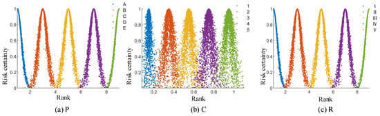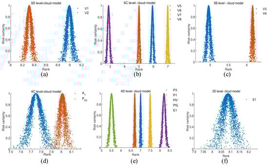 (1) Regarding the research involving screening filtering and ranking in the RFRM method, the IPC-CM model is proposed, which abandons the traditional purely qualitative way of risk matrix assessment and takes advantage of the cloud model in terms of the uncertainty of subjective perception. Based on cloud theory, cloud vertices, ranges and thicknesses are used to show the risk value of risk factors visually. The cloud model obtained by this method is scientific, intuitive, and easy to understand. Figure 8 shows the results based on the IPC-CM, which achieves a further division of the same level in the traditional risk matrix assessment []. Figure 8a–f reflects the risk value of risk factors under different levels. As a result, a preliminary screening assessment algorithm for systemic risk is formed.