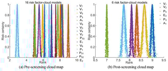 The cloud model of the above 16 risk factors is sorted and screened, and the standard cloud plots before and after filtering are shown in Figure 6.