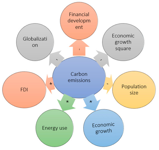 An investigation using the EKC hypotheses found that FDI, trade, and renewable energy influence carbon emissions, with renewable energy decreasing CO2 emissions, FDI reducing carbon emissions, and trade tending to increase CO2 emissions [24,25]. This study was based on Pakistan’s economy under the ARDL simulations model. It assessed the influence of financial factors on carbon emissions, with the results showing that FDI, energy usage, and trade have a positive influence on carbon emissions and have the same influence on financial, social, and political indices [26,27]. It was shown that financial growth, and green contamination by CO2 release, had a significant influence on four BRICS countries from 1981 to 2015 [7].