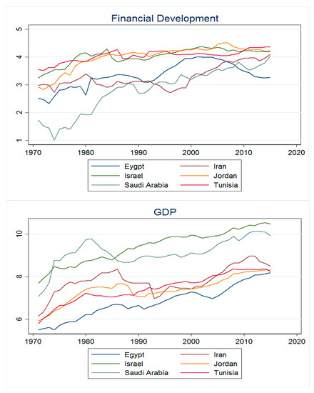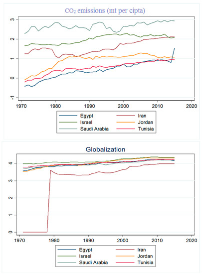 Globalization can be defined as the process that allows the business community, governments, and other entrepreneurs across the globe to interact with each other for economic purposes. In the 1970s, the idea of encouraging business growth, increasing capital modernization, and expanding and conserving cultural, political, and social exchange was developed. Globalization, along with its key policies, has paved the way for the economic, sectarian, and cultural development of nations. It also has significant environmental implications at the regional and international levels. The new era is defined by globalization, because advancement and innovation in business are related to air quality and pollution [1,2]. The results show that financial growth exacerbates environmental degradation. It is noted that globalization has a key role in financial development [3]; however, only a few studies demonstrate that financial development has a significant number of positive effects. In this view, modernization fails to reduce the level of environmental discharge. For this reason, we assessed financial development in this study. Many studies establish a positive nexus between energy usage and CO2 emissions, and show that economic development can be achieved by efficient and effective productivity [4,5,6]. It is also accepted worldwide that increasing energy use will result in the release of harmful gases [7]. Figure 1 shows CO2 emissions, and financial globalization development in the MENA (Middle East and North Africa) countries.