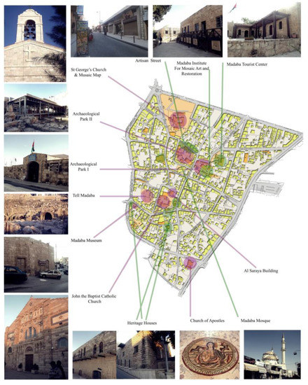 Madaba is a Jordanian city and the administrative center of the Governorate of Madaba. Madaba, known as “the City of Mosaics”, is situated 33 km southwest of Amman, the capital of Jordan. Recently, Madaba was named the Arab Tourism Capital for the year of 2022 [4]. The city has rich historical attributes due to the succession of different civilizations. These historical sequences can be easily noticed in the city’s veritable and unique urban form, heritage buildings, and religious monuments (Figure 1). According to several historical studies, life in Madaba started in the Bronze Age (3200-2100 B.C.) [49]. After that period, Madaba has witnessed several civilizations (e.g., Moabites, Assyrians, and Babylonians). Some civilizations have left a clearer imprint on the city than others, such as the Nabateans in the 2nd century B.C., the Romans in the 1st century A.D., the Byzantines until the 6th century A.D., and the advent of Islam through the first half of the 7th century A.D. [49,50,51].
