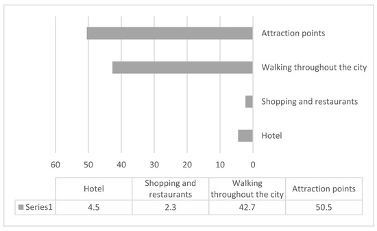 As shown in Table 1, Approximately 42.7% of the 131 respondents indicated that they spent most of their time walking throughout the city. Moreover, 50.5% of participants mentioned that archeological sites, old churches, and museums were their main destination (Figure 4).