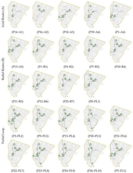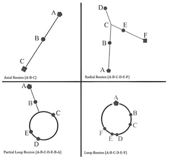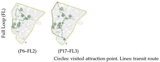 In total, 26 spatial styles of tourists were found in the study area. These styles, which were derived from tourist diaries and observations, were simplified into symbolic illustrations, as shown in Figure 5. The attraction points were presented as points, and the connecting routes between these points were symbolized as straight lines. Accordingly, the illustrations were grouped again based on specific movement characteristics into four spatial patterns (P): axial routes (A), radial routes (R), partial loop (PL), and full loop (FL) (Figure 5).