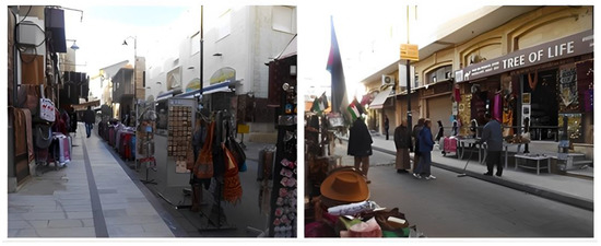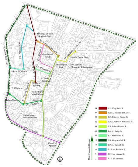 The two routes with the highest tourist spatial concentration in Madaba’s historical core were King Talal Street (R1) and Al Hussain Bin Ali Street (R2). (Figure 7). These two routes were the main parts of revitalization projects by the Ministry of Tourism and Antiquities (MOTA) [53]. Apart from the fact that it is considered the most accessible route to hotels and connects the most visited places (St. George’s Church and John the Baptist Catholic Church), as illustrated in Figure 8, it is recognized as the main commercial spine of the historic center, where a lot of tourist services and handicraft shops are located along the street as part of the MOTA’s revitalization projects [53]. Thus, most of the rehabilitative actions and maintenance are concentrated there.