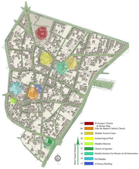 Cultural and heritage tourism is considered one of the most fundamental components of the tourism sector, which represents 39% of total tourism worldwide [5,6]. Around 85% of overseas tourists come to Jordan for culture and heritage destinations [3]. Thus, over the next three years, major financial investments are intended in Jordan for conservation and preservation purposes, including making significant upgrades to 15 main cultural and heritage attractions, including Madaba (2022–2024) [3]. As interest in urban heritage and cultural tourism grew, it became increasingly important to adapt the notion of “sustainable tourism” to protect, develop, and promote cultural heritage assets [7,8,9].