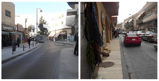 Although King Talal Street is considered a relatively narrow route and one of the main arteries for vehicle traffic in the city, a paved sidewalk was allocated along it (Figure 9). Conversely, Al Hussain Bin Ali Street is the only well-designed artisan pedestrian route in the study context (Figure 10). It contains the largest number of handicraft shops. Tourists can stop and inspect the crafts freely without fear of vehicular traffic. Princess Basma Street (R3) and Abu Baker Al Seddeeq Street (R4) were the third and fourth most frequented routes, respectively. R3 recorded a higher movement density than R4, despite the fact that R3 does not have a decent sidewalk for pedestrians like R4 does (Figure 11), where tourists can walk on a relatively wide and well-designed paved sidewalk. In this case, the movement density in R3 can be related to another spatial factor, which is the connectivity of this route with the most visited route, King Talal Street.