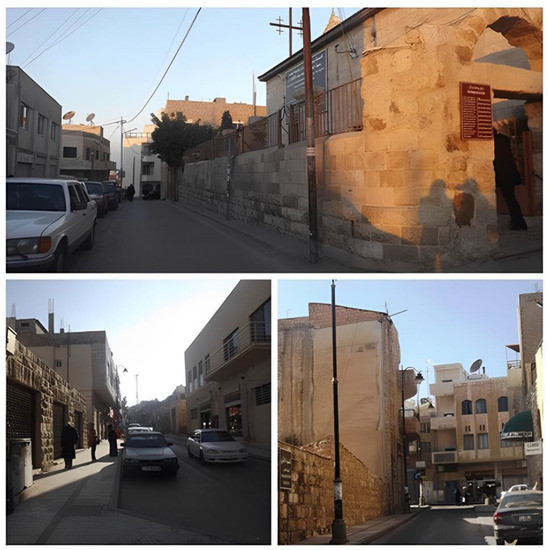 The Roman period was an important milestone for Madaba. It was regarded as one of the Moab–Kerak Plateau’s commercial centers (Ibid.). In the 4th century, particularly after the liberation of Christians from Roman oppression, Madaba became an essential center that flourished in trades and crafts, especially mosaic art. Many of them are still in their original places (e.g., churches and houses) and are considered some of the world’s greatest examples of Byzantine mosaics [52]. Inevitably, these morphological changes were accompanied by a series of road network developments and interventions, which occurred in different directions around the core of the city to align with urban expansion, forming a ring road that connects the inner core of the city with the outer districts and regions [53]. The study is confined to the historical core of Madaba city (Figure 2). The physical fabric of the city evokes the old architectural characteristics of the old Ottoman villages in the period between the late 19th century and the early 20th century. Most Madaba buildings are composed of one to two stories. Madaba combines different architectural styles: the cultural and heritage places are associated with the 6th and 7th centuries’ mosaics and churches; the vernacular style, which is clearly represented in its traditional old houses that date back more than a hundred and fifty years; and the recent widespread modern architectural style.