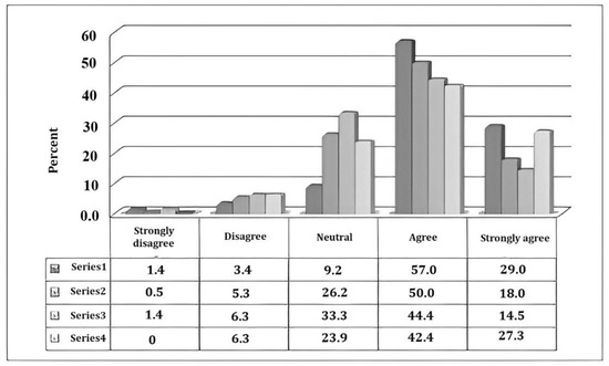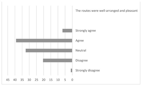 Almost half of the tourists (46.1%) were satisfied with the general arrangement of the layout of the routes, 21.4% disagreed or strongly disagreed, and 32.5% were neutral about this (Table 4). This result was expected because of the effect of the various spatial factors under this variable on the overall tourists’ perception of the study context (Figure 12). The tourists were also satisfied with the arrangement of attraction points (70%), and 87% agreed to strongly agreed that the overall experience at the destination was satisfactory (Table 4).