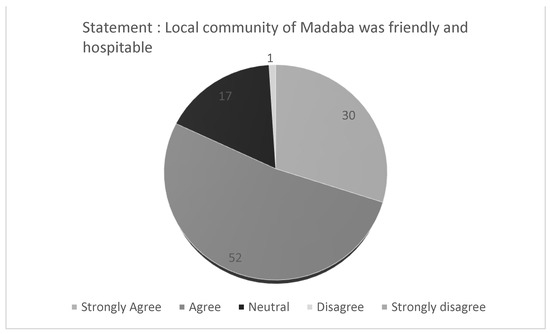 Urban studies proved that people tend to move along routes where certain activities and spatial elements are concentrated, such as commercial activities, landmarks, attraction points, or cultural and social events. In this study, the density of tourist movement was concentrated more on the routes where most of the tourist activities and products are gathered. For example, it has been observed on several occasions that tourists who passed through King Talal and Al Hussain bin Ali to reach their destination returned to the same route to spend more time compared with the first time spent shopping at the various handcraft shops. Tourists enjoyed walking on the routes that had a high concentration of locals’ commercial activities. They illustrated in both the survey and interviews that meeting with the locals and identifying with their lifestyle was part of their experience in the city (Table 5). Thus, many tourists expressed special admiration for Prince Hassan Street as it showed the daily life of the locals of Madaba and their products. In fact, the direct interaction between the tourists and the locals in these popular “Souks” was convenient and pleasant from the standpoint of tourists. This is confirmed by the results of the survey, where the majority of respondents (82%) agreed or strongly agreed that the locals were very friendly and hospitable, whereas 17% of them were neutral, and only 1% disagreed with this (Figure 13).
