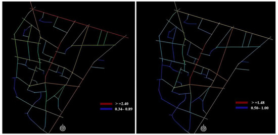 (Left): Local integration analysis map (R = 3) and (Right) global integration analysis map (R = n) of the study area using DepthmapX.