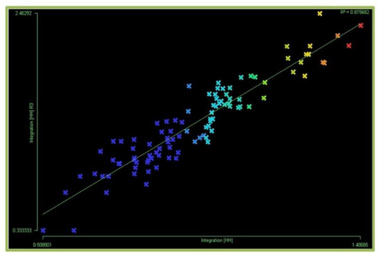 The level of intelligibility of the historical core of Madaba has also been investigated. Urban intelligibility is very essential in explaining how several types of spatial relations affect spatial behavior due to the fact that the level of predictability of how users move is connected to the level of intelligibility [22,54]. Syntactic intelligibility can be examined by studying the correlation between the local and global integration measurements using a scatter diagram. If the group of dots that represent the global and local integration values in the scatter diagram is tight enough and shapes a linear scatter around the regression line, then it can be said that the local context is intelligible in the global urban environment. In this case, Figure 16 shows this correlation using a scatter diagram analysis. Each line represents a dot regarding its level of global and local integration on the X- and Y-axes, respectively. The correlation (R2 = 0.875) between the two levels of integration, as shown in the scatter diagram, indicates that the spatial configuration of the study context is relatively intelligible. This intelligibility is reflected in the spatial cognition of tourists that have been represented by their sketch maps.