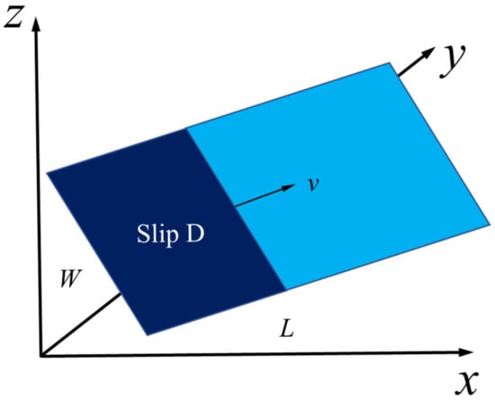 Regarding microseismology, fault-slip-type seismic sources are generally regarded as point sources. However, if a seismic source is regarded as a point source, it must satisfy the far-field condition. Nevertheless, a point source model adopted in the near field cannot describe fault properties such as size, location, or radiation patterns. Therefore, in engineering practice, when dynamic disturbance analysis of a rock mass near a seismic source is carried out, fault planning and regularizing are necessary [29]. Currently, the slippage behavior of faults is described by the dislocation model of faults, as shown in Figure 1 and Figure 2, in which: v is the fault-slip velocity (m/s); D represents the slip amount in the fault rupture zone (m); and L and W are the length and width of the two-dimensional fault surface [26,27].