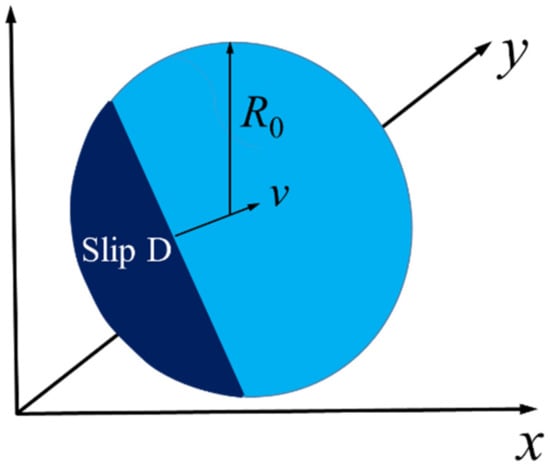 In seismology, the widely used circular seismic source was proposed by Savage, Brune, and Keyless-Borok [30]. The advantage of using the circular seismic source is that it avoids the non-singularity of the fault slippage boundary, and it is a smooth transition between the fault slip and stress changes. In the circular seismic source, the rupture starts from the center of the source and constantly breaks and slips at a constant rate, following the principle of self-similarity. The simple solution to this type of problem is given by Equation (1):