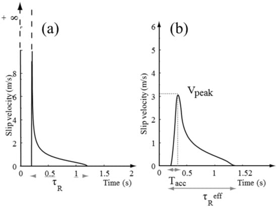 Comparison between the original Yoffe function (a) and the regularized Yoffe function (b). Vpeak is the peak velocity; τR is the slip time from Vpeak to the end; and is the slip time from zero to the end.