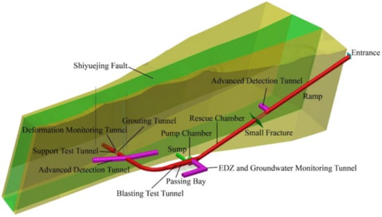 The Beishan exploration tunnel with a maximum buried depth of 50 m is located in an old well area of Beishan, Gansu Province. The engineering includes an inclined shaft, test drift, water storage, and tunnel engineering. The Shiyuejing fault has a tilt angle of 20° and a total length of 146.19 m. The water tank is at the bottom of the inclined shaft, perpendicular to the drift, at a distance of 20 m. In addition, there are four extraordinary test chambers, respectively, located in the middle of the inclined shaft. The inclined shaft levels out, and the left and right sides of the curved shaft section extend outward, with a total length of 90 m. As an essential part of the URL’s safety technology research project, the exploitation tunnel provides a test platform for the excavation, support, advance detection, and evaluation technology of the excavation damage zone, as shown in Figure 4.