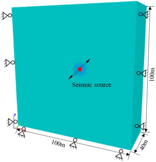 In discussing the rock mechanics of the geological disposal repository of radioactive waste, the relevant scholars at home and abroad have also conducted corresponding research on the rock mechanics of URLs. Khayrutdinov et al. [17] proposed a mathematical modeling method to solve the problem of reusing man-made waste from the mining and processing of ores, which has been successfully applied. Rybak et al. [18] used FLAC3D to analyze the conditions of change in the state of an underworked rock mass, revealing the deformation mechanism of salt deposits with stowing. Litvinenko [19] focused on the topical geomechanical and geodynamic problems of mining, proposing a methodology for geomechanically safe underground space mining. Kongar-Syuryun et al. [20] presented a method to solve the problem of choosing a technology for developing a mineral deposit and selecting a rational filling mixture composition for given filling parameters. Jing conducted a comprehensive analysis and elaborated on the numerical methods, laboratory tests, and work conducted in China on the geological disposal of nuclear waste [21]. Niu [22] carried out in situ stress measurement and numerical simulation research on the stress state of the surrounding rock affecting a nuclear waste geological disposal repository. Yang [23] studied the coupling effect of rock mass excavation blasting and transient unloading under the high in situ stress state of a nuclear waste geological disposal repository. Kown et al. [24] conducted a numerical simulation of the fracture penetration rate based on factors such as rock mass excavation damage, thermal load, and glaciation. They analyzed the variation in the fracture penetration rate under stress redistribution. In addition to the geo-stress, blasting load, and thermal coupling factors, the seismic waves caused by fault dislocation and slips are significant disturbances affecting the stability of surrounding rock in underground engineering. The moment tensor theory is a standard method for analyzing the microseismic events caused by fault slips. The failure characteristics of the rock mass can be described effectively by studying the focal mechanism. It is well known that a fault in three-dimensional space has different orientations, angles, sizes, and so on. Through the use of numerical simulation, many scholars have reproduced fault slips to analyze the response characteristics in the rock mass and assess the rock mass damage risk. For example, Lei et al. [25] simulated a geological repository of nuclear waste in Sweden under a large earthquake. They performed a detailed analysis of the expansion of the fracture network under different slips. Chen et al. [26,27] simplified the seismic source into a rectangular fault plane and simulated the fault-slip process with a simple sinusoidal function velocity load. On this basis, Lan et al. [28] optimized the velocity mode of a fault slip using the Yoffe function velocity load, which is similar to that occurring in engineering practice, and studied the dynamic behavior of rock mass under different radiation modes. The above research methods for studying the fault ruptures and sliding rock masses caused by dynamic responses are research achievements. However, there are still some deficiencies in this field of research; for example: adopting the point source method, a failure to consider fault parameters such as shape and orientation, and some numerical simulation factors in the process of creating slippage fault from breakdown have not been examined. As a result, it is necessary to construct a seismic source using the shape of the fault section and the rupture effect, and to then analyze the dynamic response characteristics of the rock mass.