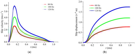 Seismic source parameters can be obtained according to Equations (3), (8) and (10). Once the seismic moment is determined, the fault radius, fault area, and slippage displacement are all related to the corner frequency f0. In this paper, the corner frequencies of 80 Hz, 100 Hz, and 120 Hz are used to determine the rupture area, respectively, as shown in Table 2. According to the previous simulation results [28], the modified Yoffe function selects τs = 0.1 ms and τR = 0.8 ms; the slippage velocities are shown in Figure 6a, and the corresponding displacements are shown in Figure 6b.