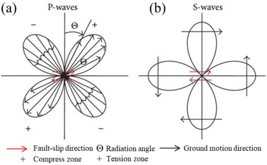 Radiation pattern diagrams of the radial displacement component of P-waves (a) and the transverse displacement component of S-waves (b).