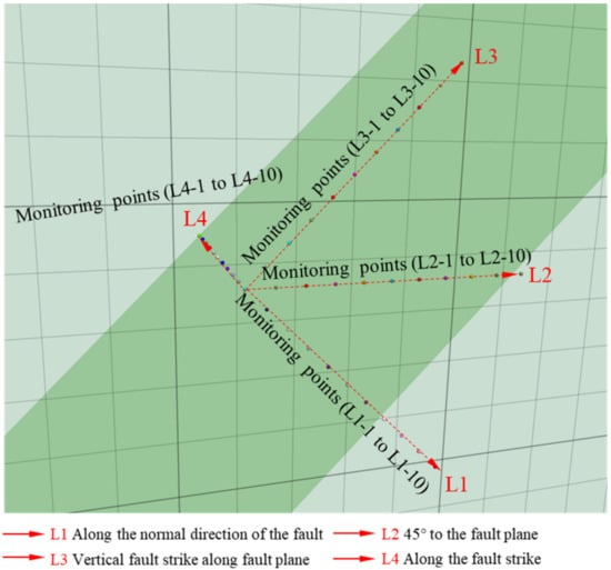 Due to the double-couple effect during fault slipping, the stress wave radiates outward from the epicenter center with spatial differences. The typical stress wave radiation patterns shown in Figure 8 are the patterns of the stress wave radiation during the slip process of the double-couple fault. An inverse fault slip with an inclination angle of 45° is simulated, and four monitoring lines are arranged around the fault, as Figure 9 shows.