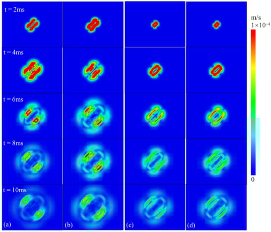 Four seismic source models are studied in this paper; we simplify the circular, rectangular, and circular and rectangular hypocenters considering the rupturing effect as Cir, Rec, Cir(CR), and Rec(CR) seismic sources, respectively, with the simulated cases listed in Table 3. On the vertical fault section and along the fault plane, the radiation patterns generated by different sources are explained by taking the equivalent fault radius of 8.75 m as an example. Figure 10 shows the stress wave radiation pattern on the vertical fault section. In the early propagation stage, the shape of the stress waves generated by different sources is similar to a two-lobed symmetrical “peanut shell”. Supposing the seismic source considers the rupturing effect, the propagation velocity of stress waves without the rupturing impact is faster than that with the rupturing impact. In addition, the S-wave radiation area of the circular source is more widely distributed than that of the rectangular source at approximately 4 ms (red zone in the velocity contour) under the same fault radius. After 6 ms, the radiation area of the rectangular seismic source is more extensive, and the influence range of the radiation intensity level is more extensive than that of the circular seismic source, which is the difference between the two in the vertical fault section. Comparing the two seismic sources, Cir(CR) and Rec(CR), the stress wave radiation patterns of the two on the vertical fault section are relatively close, and the radiation intensity and range of the two are not significantly different in different periods. At approximately 10 ms, the boundary of the P-wave and S-wave radiation area is more pronounced, and in the radiation area of the S-wave, the stress waves caused by the four sources will form relatively obvious Mach waves.